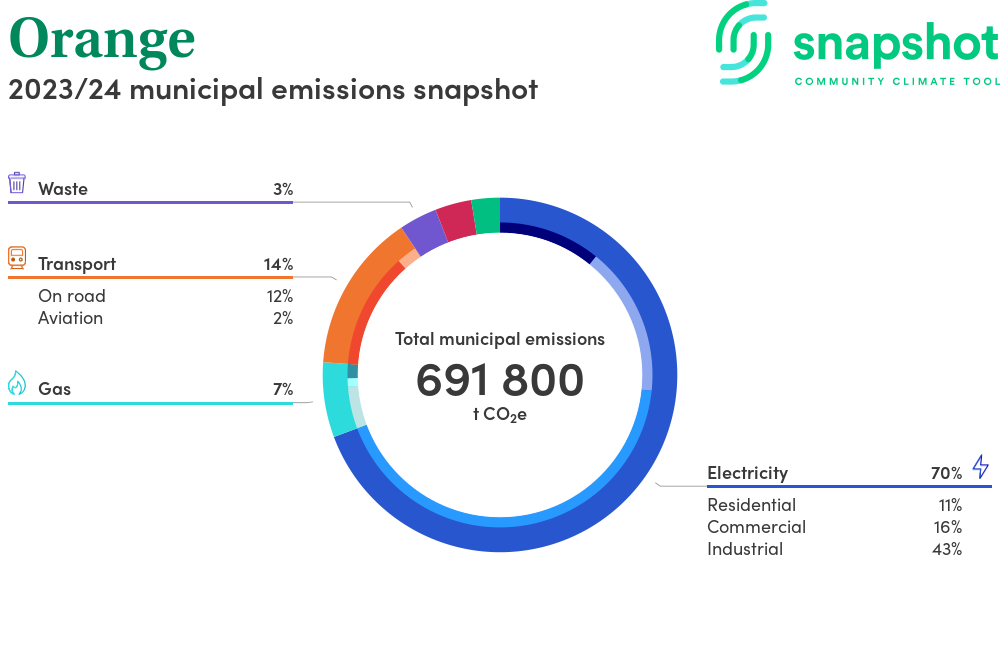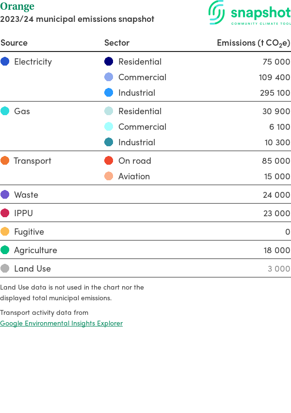 Orange is a city that is geographically small relative to the state average and has a moderate urban density. Its major emissions source is electricity consumption with the majority of this coming from industrial electricity consumption.