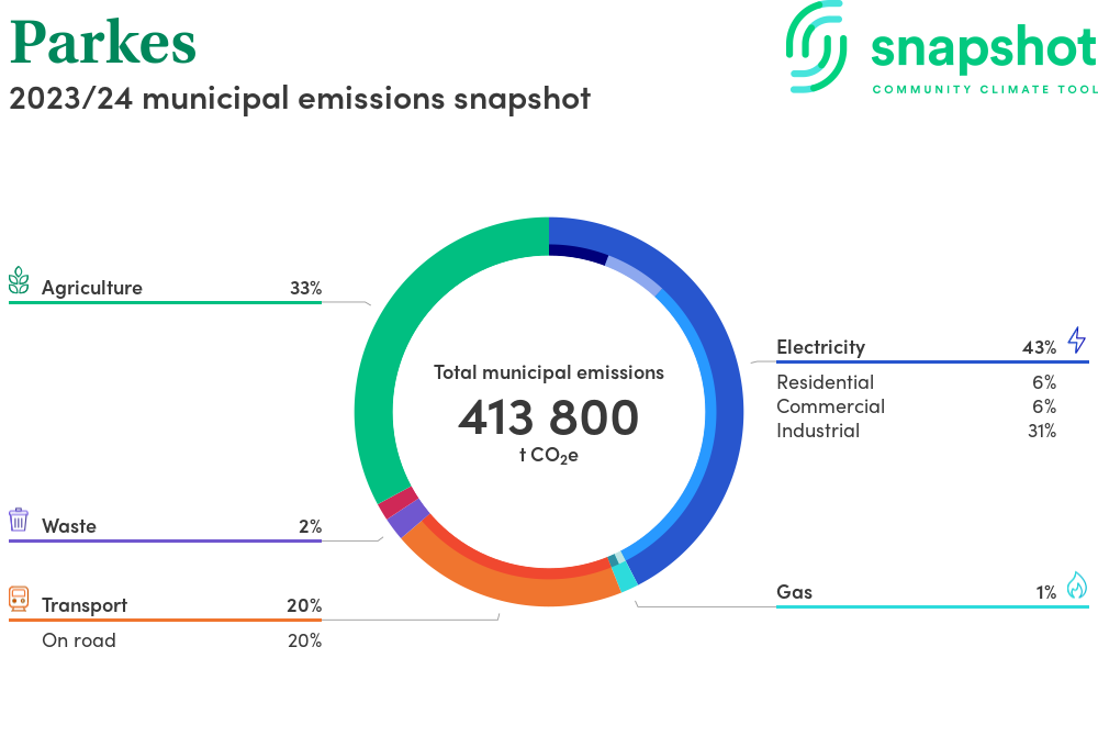 Parkes is a regional area that is moderate in size relative to the state average and has a low urban density. Its major emissions source is electricity consumption, due to the community’s scale of population and commercial activity. The second largest source of emissions is agriculture.