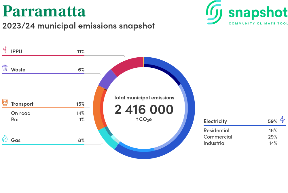 Parramatta is a city that is geographically very small relative to the state average and has a high urban density. Its major emissions source is electricity consumption with the majority of this coming from commercial electricity consumption.