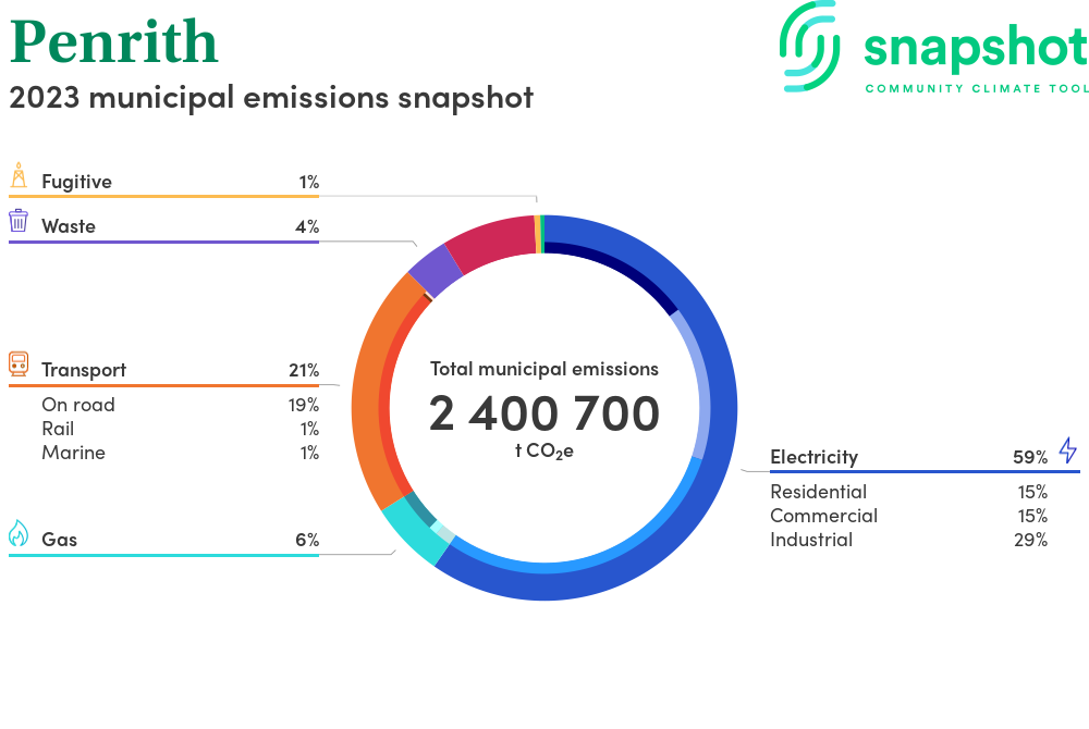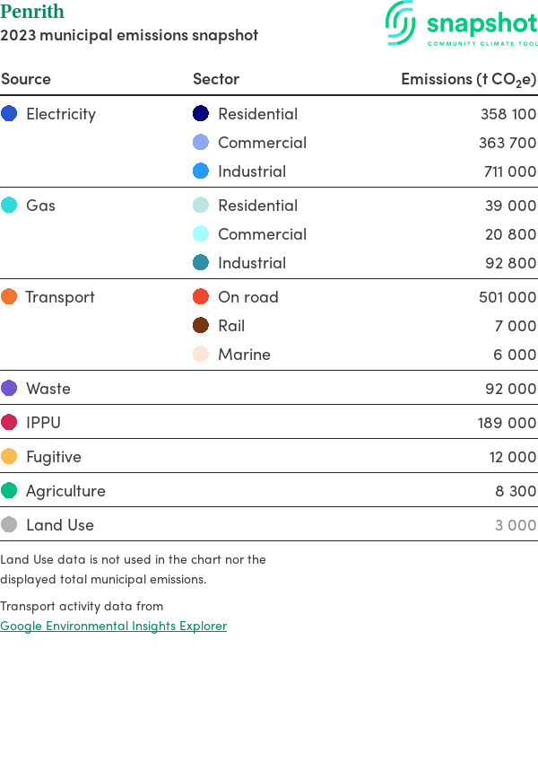 Penrith is a city that is geographically small relative to the state average and has a high urban density. Its major emissions source is electricity consumption with the majority of this coming from industrial electricity consumption.