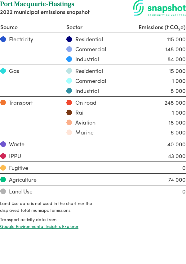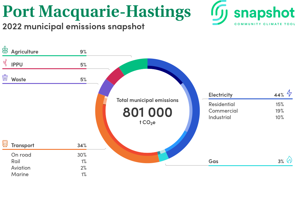 Port Macquarie-Hastings is a regional area that is moderate in size relative to the state average and has a moderate urban density. Its major emissions source is electricity consumption, due to the community’s scale of population and commercial activity. The second largest source of emissions is on road transportation.
