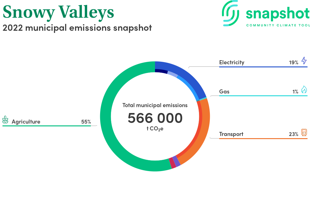 Snowy Valleys is a regional area that is large in geographical area relative to the state average and has a low urban density. Its major emissions source is agriculture, due to the community’s relatively large amount of agricultural activity and low population. The second largest source of emissions is electricity consumption.