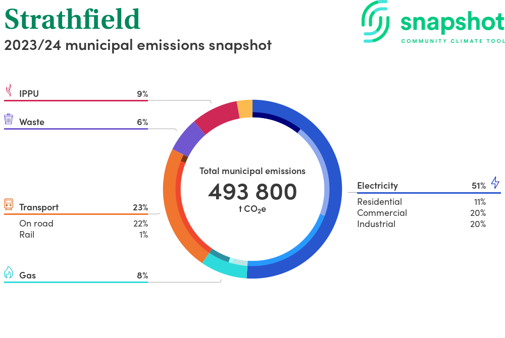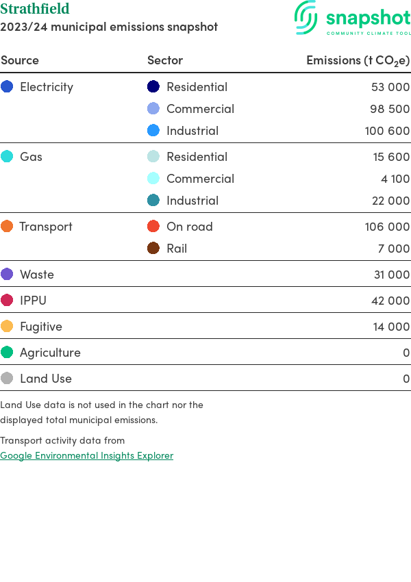 Strathfield is a regional area that is geographically very small relative to the state average and has a high urban density. Its major emissions source is electricity consumption with the majority of this coming from industrial electricity consumption.