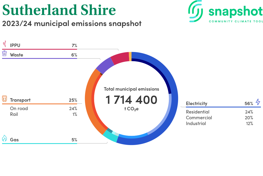 Sutherland Shire is a regional area that is geographically small relative to the state average and has a high urban density. Its major emissions source is electricity consumption with the majority of this coming from residential electricity consumption.