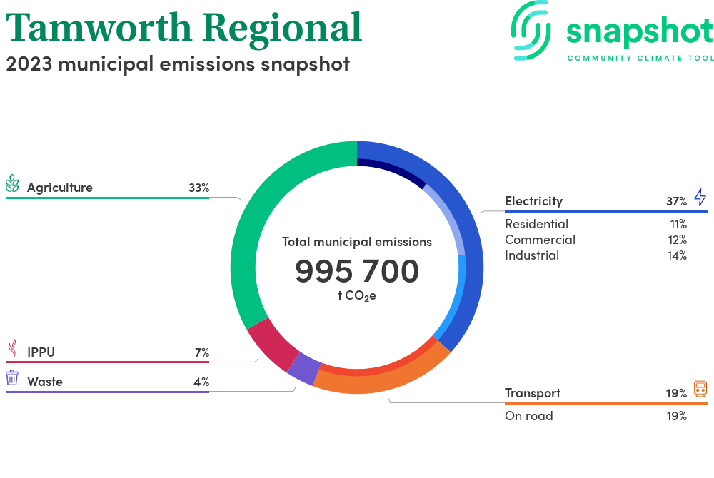 Tamworth Regional is a regional area that is large in geographical area relative to the state average and has a low urban density. Its major emissions source is electricity consumption, due to the community’s scale of population and commercial activity. The second largest source of emissions is agriculture.
