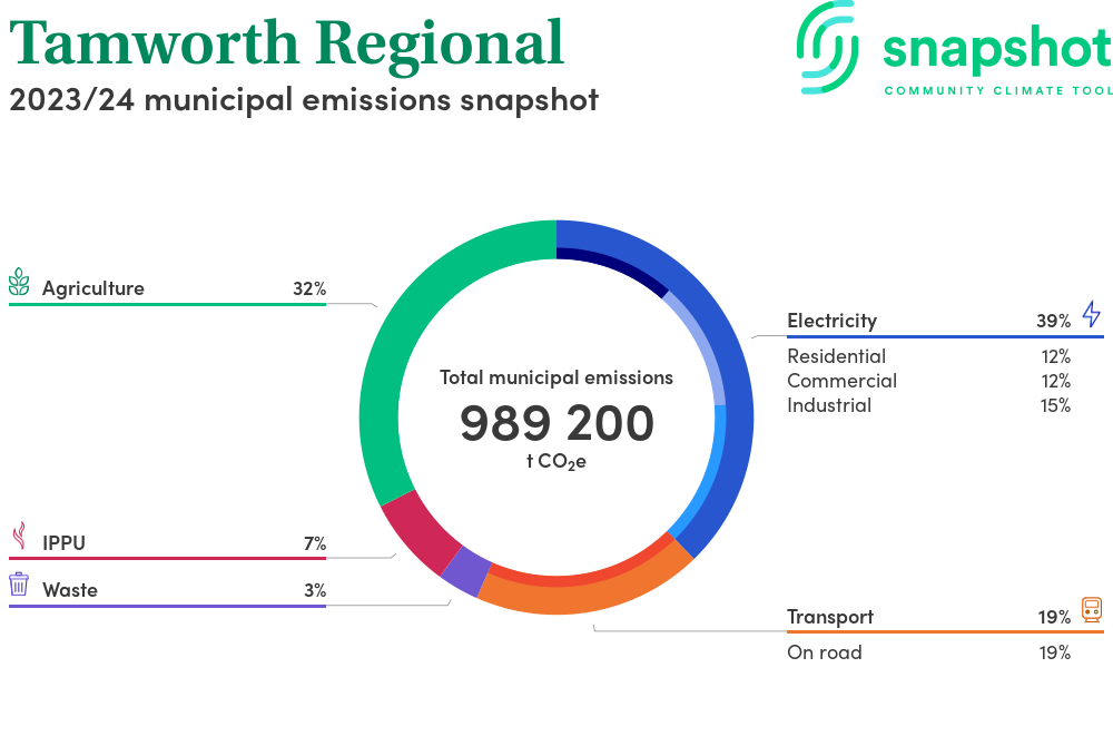 Tamworth Regional is a regional area that is large in geographical area relative to the state average and has a low urban density. Its major emissions source is electricity consumption, due to the community’s scale of population and commercial activity. The second largest source of emissions is agriculture.