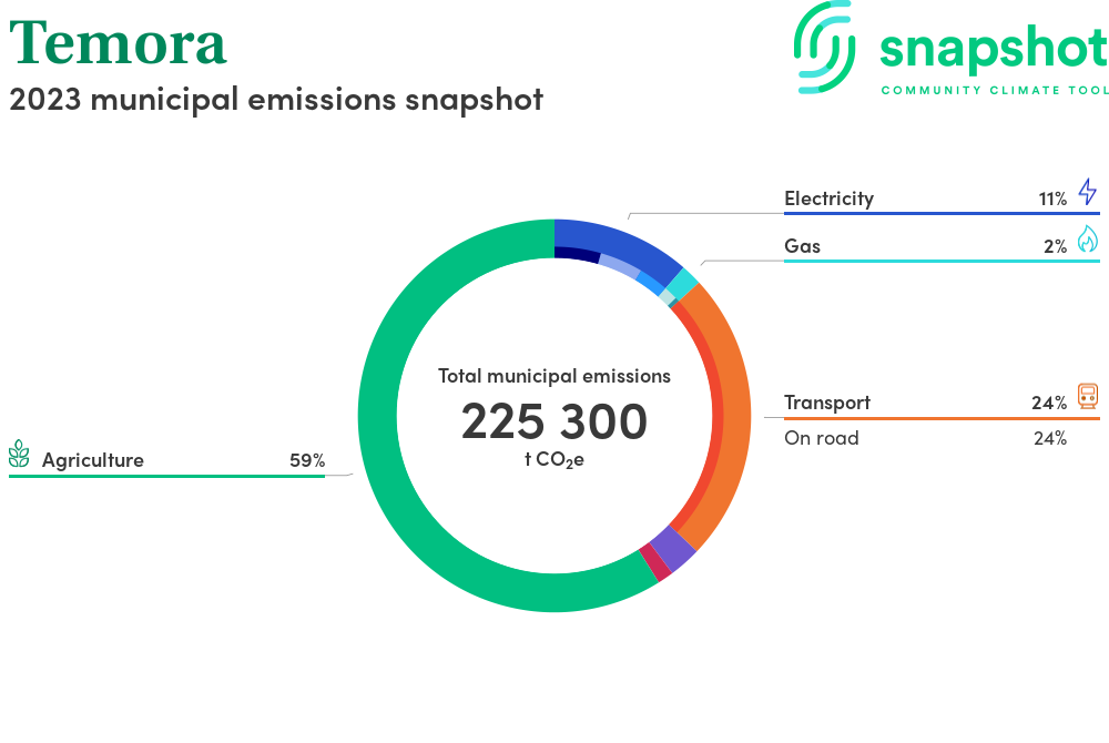 Temora is a regional area that is moderate in size relative to the state average and has a low urban density. Its major emissions source is agriculture, due to the community’s relatively large amount of agricultural activity and low population. The second largest source of emissions is on road transportation.