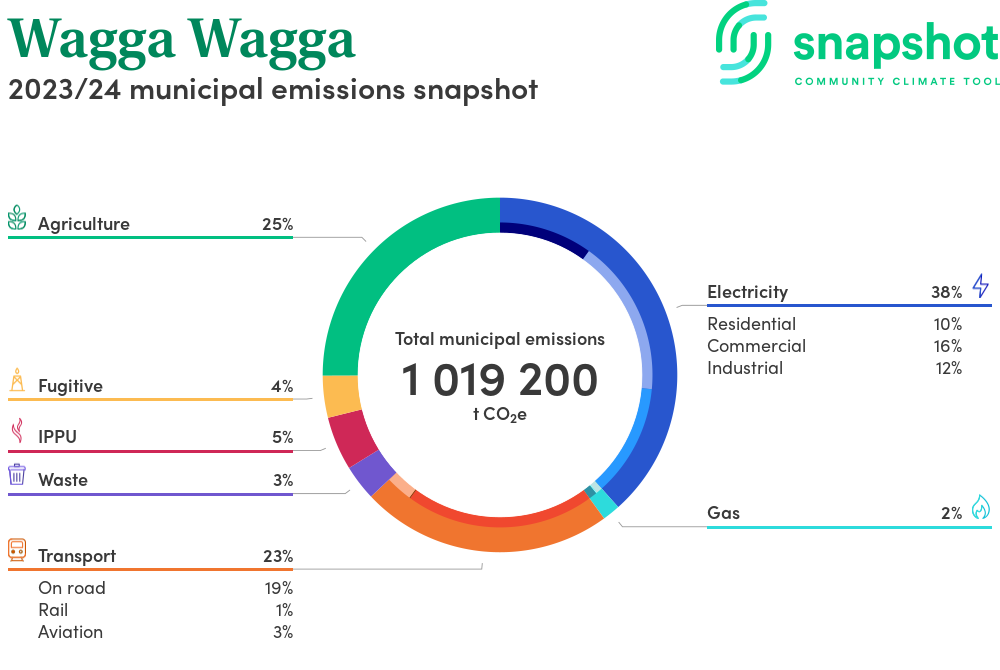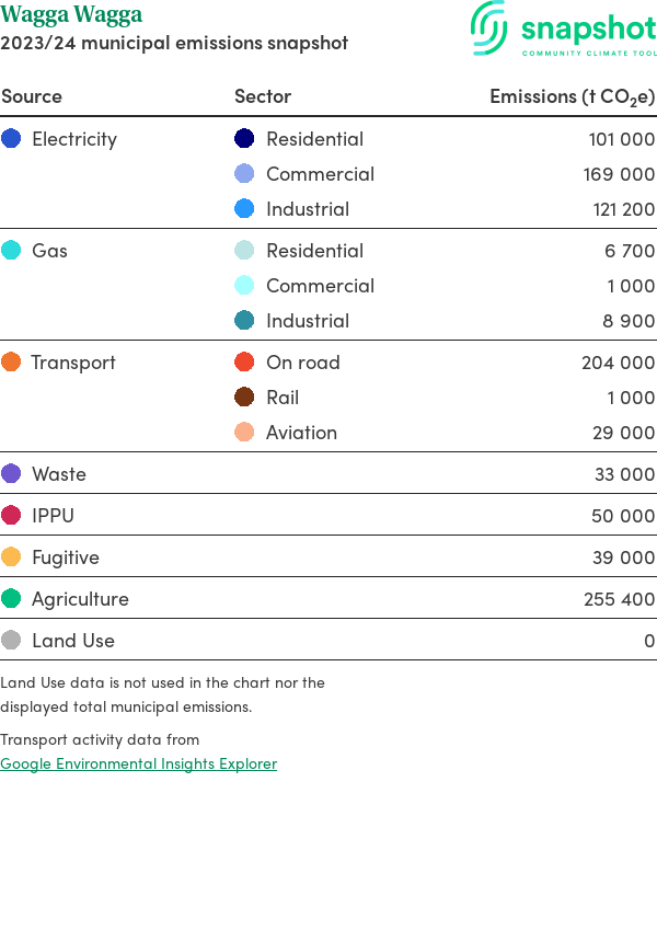 Wagga Wagga is a city that is moderate in size relative to the state average and has a moderate urban density. Its major emissions source is electricity consumption, due to the community’s scale of population and commercial activity. The second largest source of emissions is agriculture.
