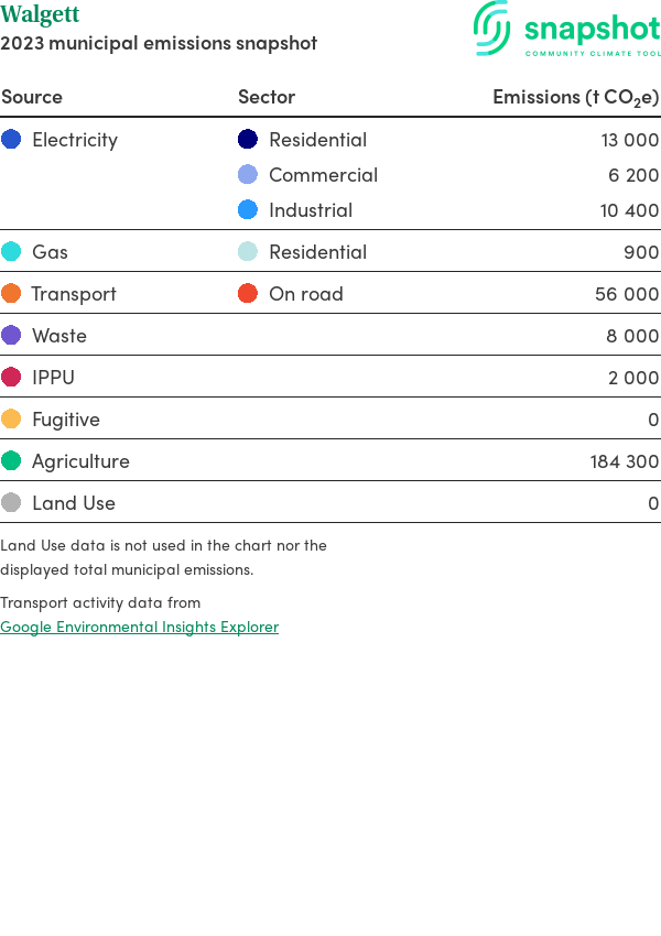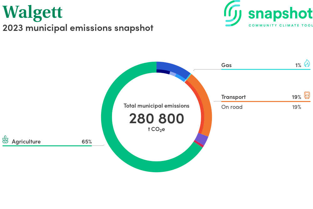 Walgett is a regional area that is large in geographical area relative to the state average and has a very low urban density. Its major emissions source is agriculture, due to the community’s relatively large amount of agricultural activity and low population. The second largest source of emissions is on road transportation.