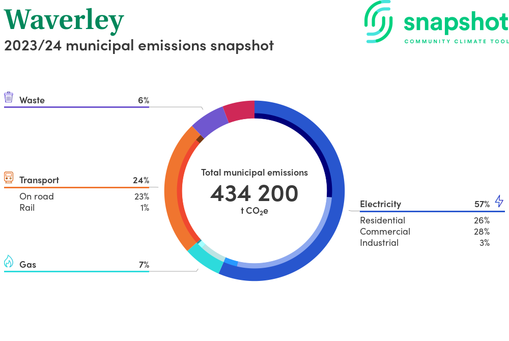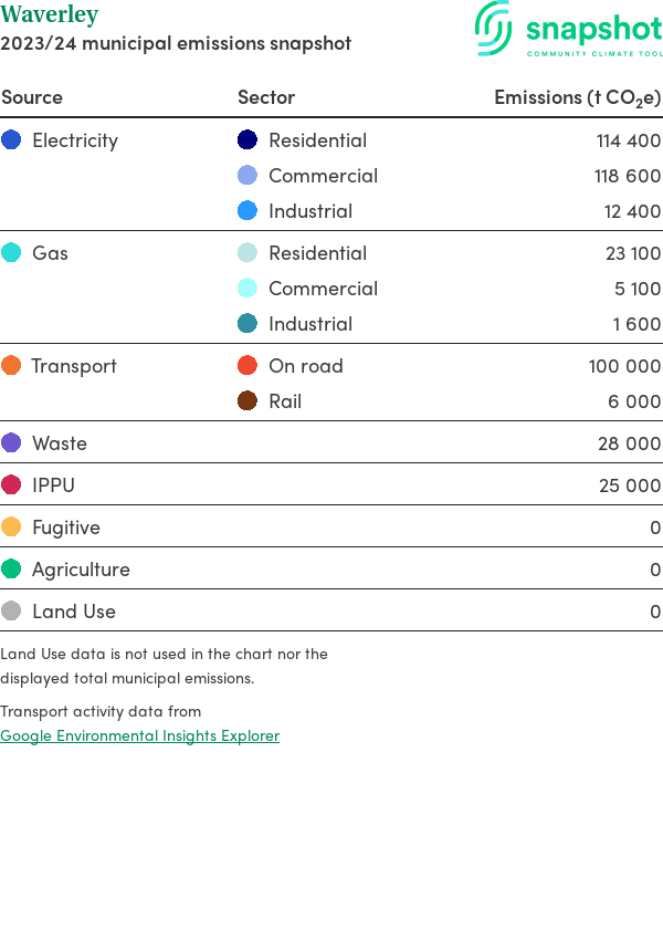 Waverley is a regional area that is geographically very small relative to the state average and has a very high urban density. Its major emissions source is electricity consumption with the majority of this coming from commercial electricity consumption.