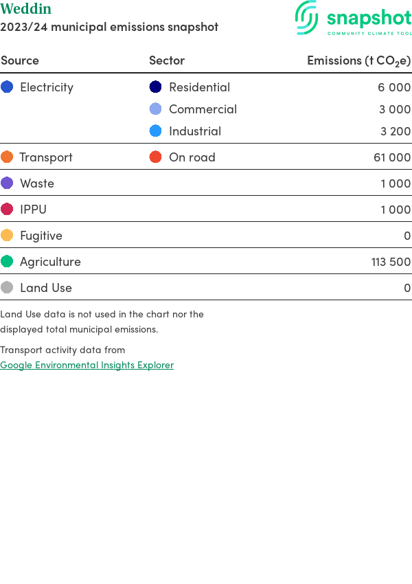 Weddin is a regional area that is moderate in size relative to the state average and has a low urban density. Its major emissions source is agriculture, due to the community’s relatively large amount of agricultural activity and low population. The second largest source of emissions is on road transportation.
