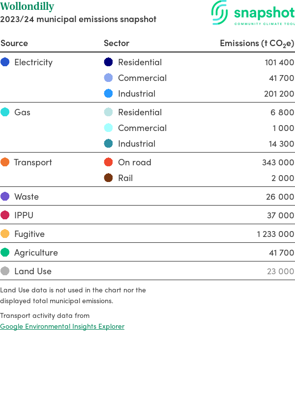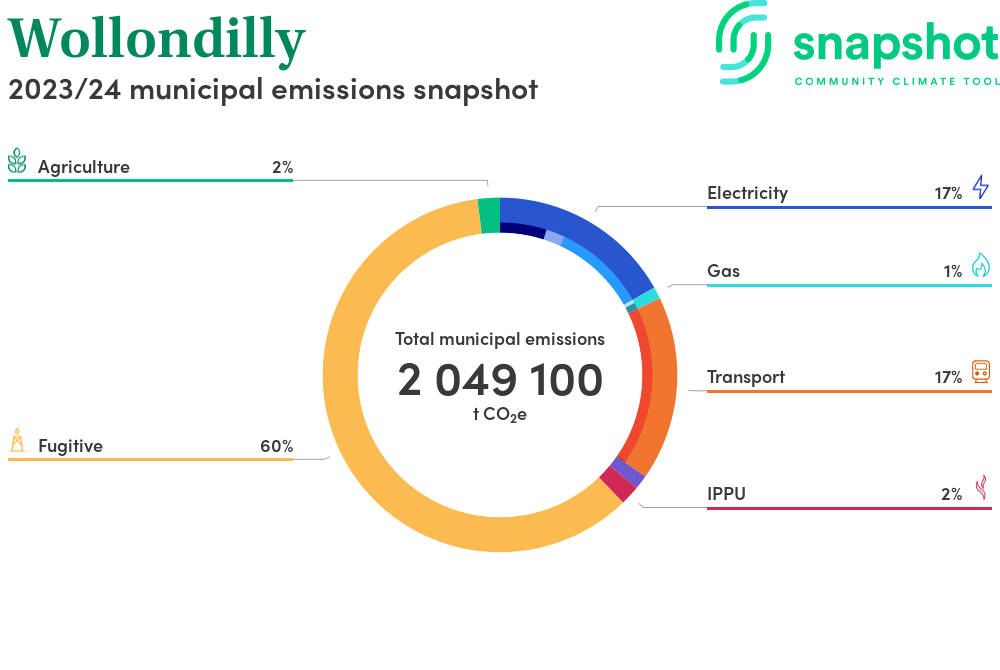 Wollondilly is a regional area that is geographically small relative to the state average and has a moderate urban density. Its major emissions source is coal mining, due to the community’s coal mining within the municipal boundary. The second largest source of emissions is electricity consumption.