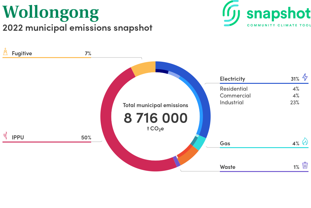Wollongong is a city that is geographically small relative to the state average and has a moderate urban density. Its major emissions source is industrial processes, due to the community’s industrial processes within the municipal boundary. The second largest source of emissions is electricity consumption.