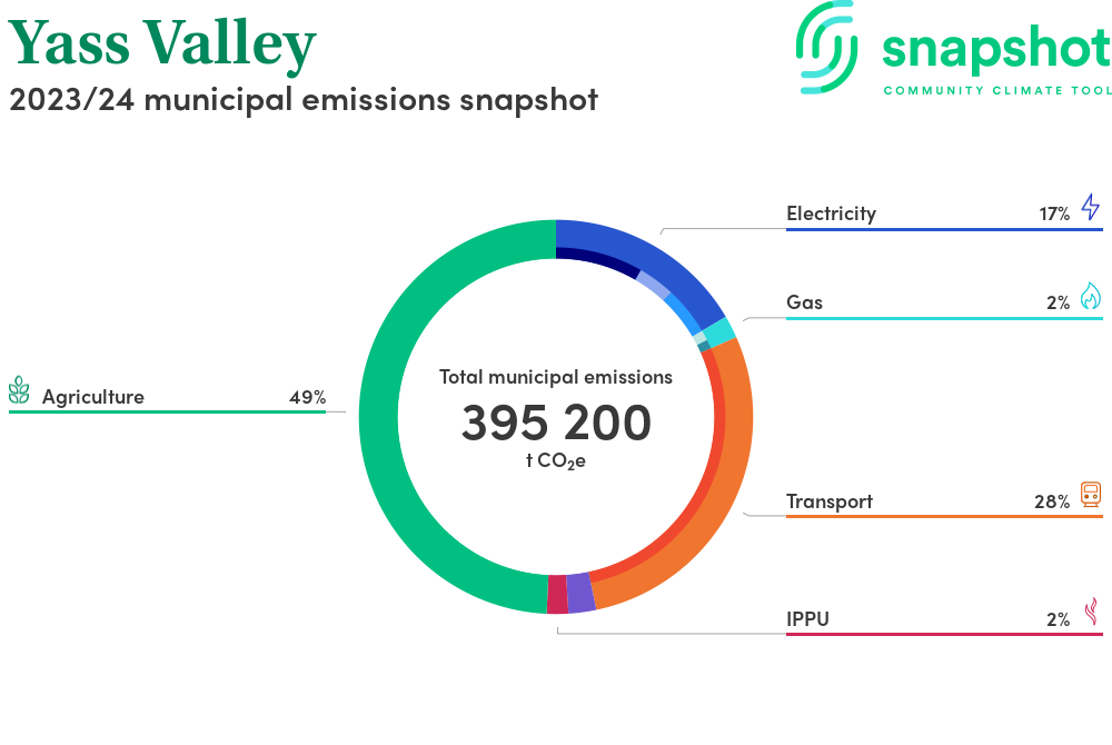Yass Valley is a regional area that is moderate in size relative to the state average and has a low urban density. Its major emissions source is agriculture, due to the community’s relatively large amount of agricultural activity and low population. The second largest source of emissions is on road transportation.