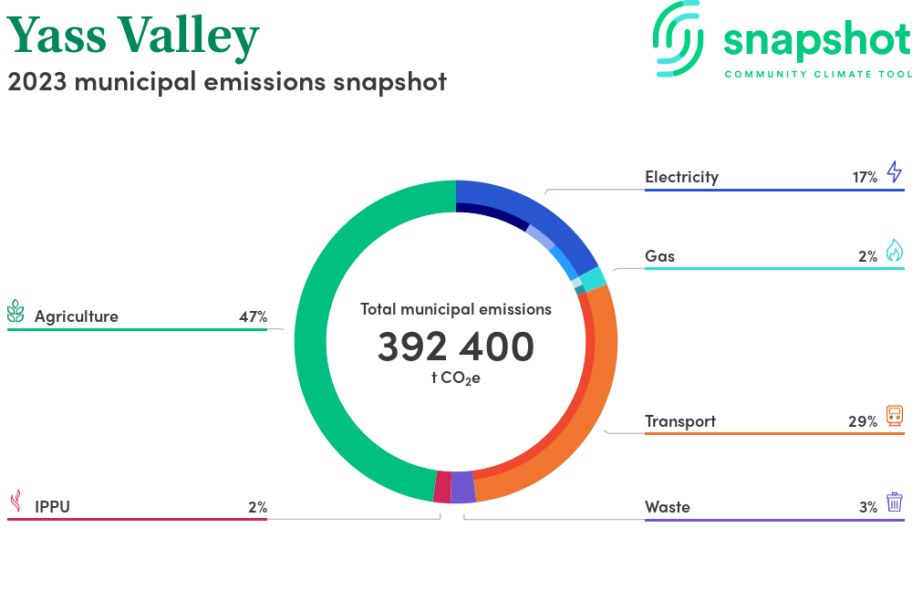 Yass Valley is a regional area that is moderate in size relative to the state average and has a low urban density. Its major emissions source is agriculture, due to the community’s relatively large amount of agricultural activity and low population. The second largest source of emissions is on road transportation.
