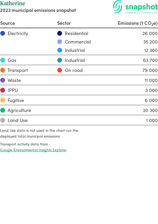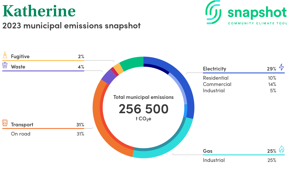 Katherine is a town that is large in geographical area relative to the state average and has a moderate urban density. Its major emissions source is industrial gas consumption, due to the community’s presence of heavy industry activity. The second largest source of emissions is electricity consumption.