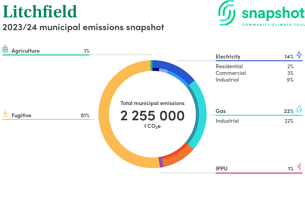 Litchfield is a municipality that is moderate in size relative to the state average and has a high urban density. Its major emissions source is oil and natural gas, due to the community’s oil and natural gas within the municipal boundary. The second largest source of emissions is industrial gas consumption.