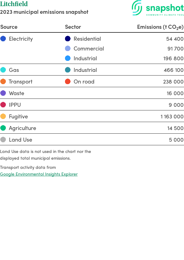 Litchfield is a municipality that is moderate in size relative to the state average and has a high urban density. Its major emissions source is oil and natural gas, due to the community’s oil and natural gas within the municipal boundary. The second largest source of emissions is industrial gas consumption.