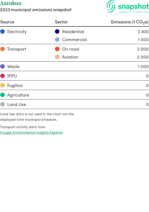 Aurukun is a rural municipality that is large in geographical area relative to the state average and has a low urban density. Its major emissions source is electricity consumption with the majority of this coming from residential electricity consumption.