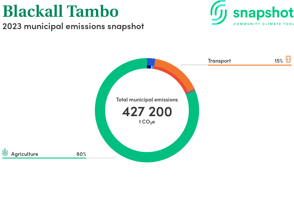 Blackall Tambo is a regional area that is large in geographical area relative to the state average and has a low urban density. Its major emissions source is agriculture, due to the community’s relatively large amount of agricultural activity and low population. The second largest source of emissions is on road transportation.