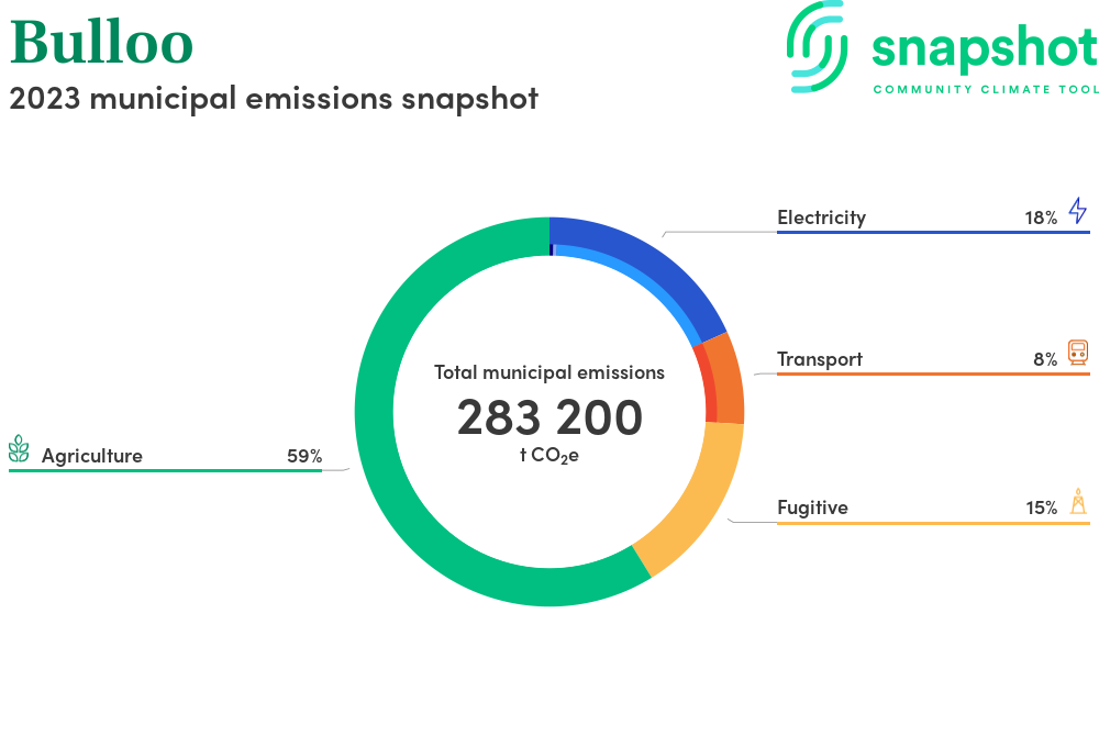 Bulloo is a rural municipality that is very large in geographical area relative to the state average and has a very low urban density. Its major emissions source is agriculture, due to the community’s relatively large amount of agricultural activity and low population. The second largest source of emissions is electricity consumption.