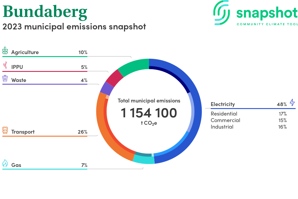 Bundaberg is a regional area that is moderate in size relative to the state average and has a high urban density. Its major emissions source is electricity consumption, due to the community’s scale of population and commercial activity. The second largest source of emissions is on road transportation.