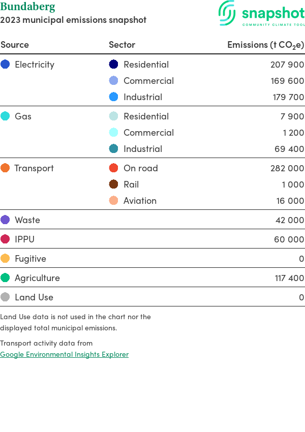 This report outlines the major sources of carbon emissions for the entire region (municipality, electorate, or state). Due to the approximate nature of the profile, the emission values are represented as rounded numbers. This report includes the following sources: