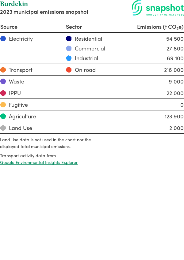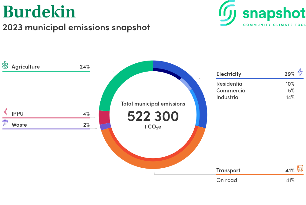 Burdekin is a rural municipality that is moderate in size relative to the state average and has a moderate urban density. Its major emissions source is on road transportation, due to the community’s larger commuting and other travel requirements. The second largest source of emissions is electricity consumption.
