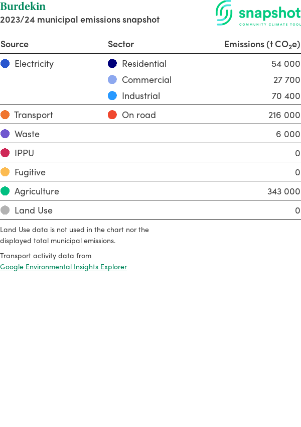 This report outlines the major sources of carbon emissions for the entire region (municipality, electorate, or state). Due to the approximate nature of the profile, the emission values are represented as rounded numbers. This report includes the following sources: