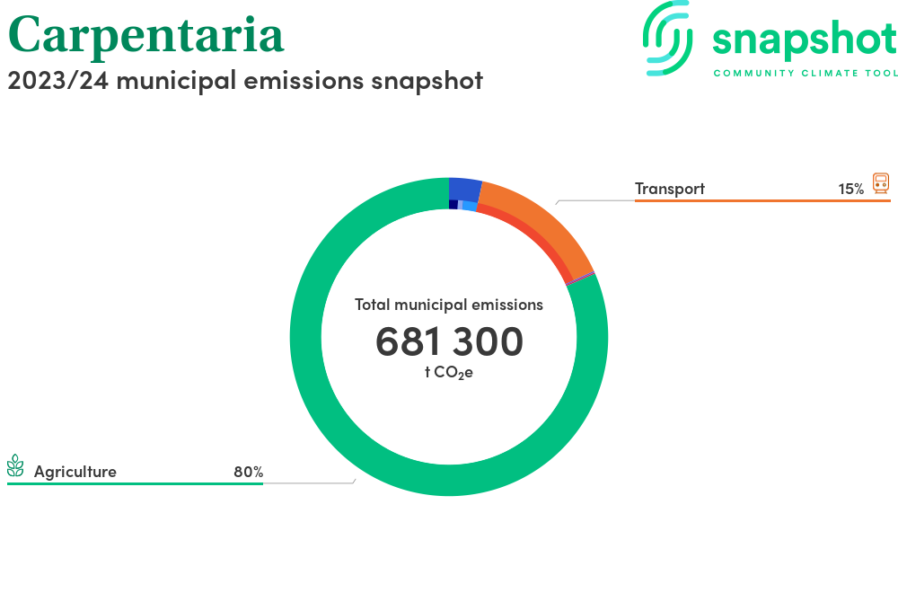 Carpentaria is a rural municipality that is very large in geographical area relative to the state average and has a low urban density. Its major emissions source is agriculture, due to the community’s relatively large amount of agricultural activity and low population. The second largest source of emissions is on road transportation.