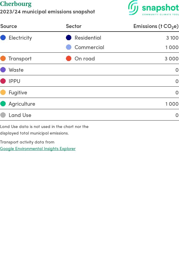 Cherbourg is a rural municipality that is geographically very small relative to the state average and has a high urban density. Its major emissions source is electricity consumption with the majority of this coming from residential electricity consumption.