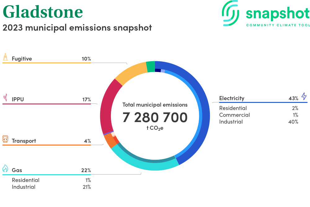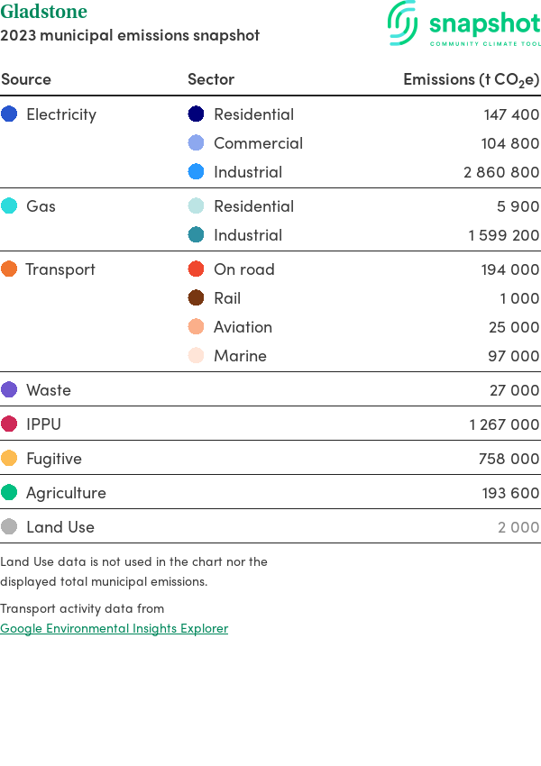 Gladstone is a regional area that is large in geographical area relative to the state average and has a moderate urban density. Its major emissions source is electricity consumption with the majority of this coming from industrial electricity consumption.
