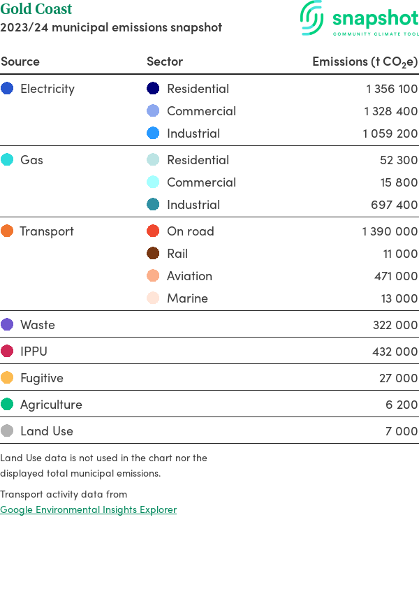 Gold Coast is a city that is geographically small relative to the state average and has a very high urban density. Its major emissions source is electricity consumption with the majority of this coming from commercial electricity consumption.