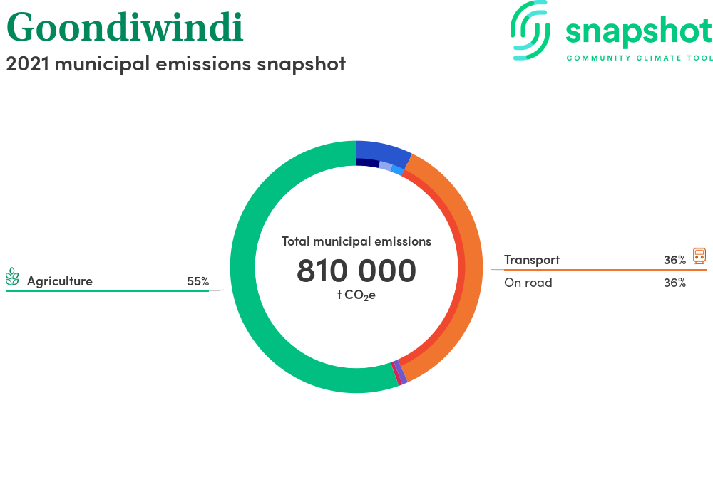Goondiwindi is a regional area that is large in geographical area relative to the state average and has a low urban density. Its major emissions source is agriculture, due to the community’s relatively large amount of agricultural activity and low population. The second largest source of emissions is on road transportation.