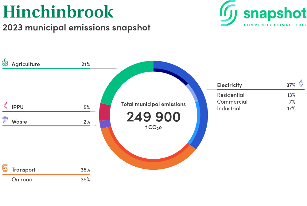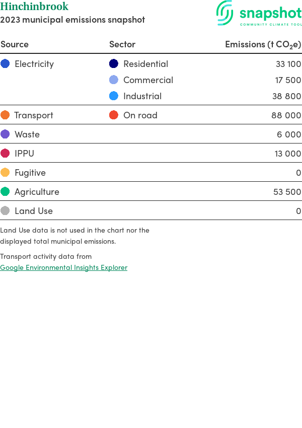 Hinchinbrook is a rural municipality that is moderate in size relative to the state average and has a moderate urban density. Its major emissions source is on road transportation, due to the community’s larger commuting and other travel requirements. The second largest source of emissions is agriculture.