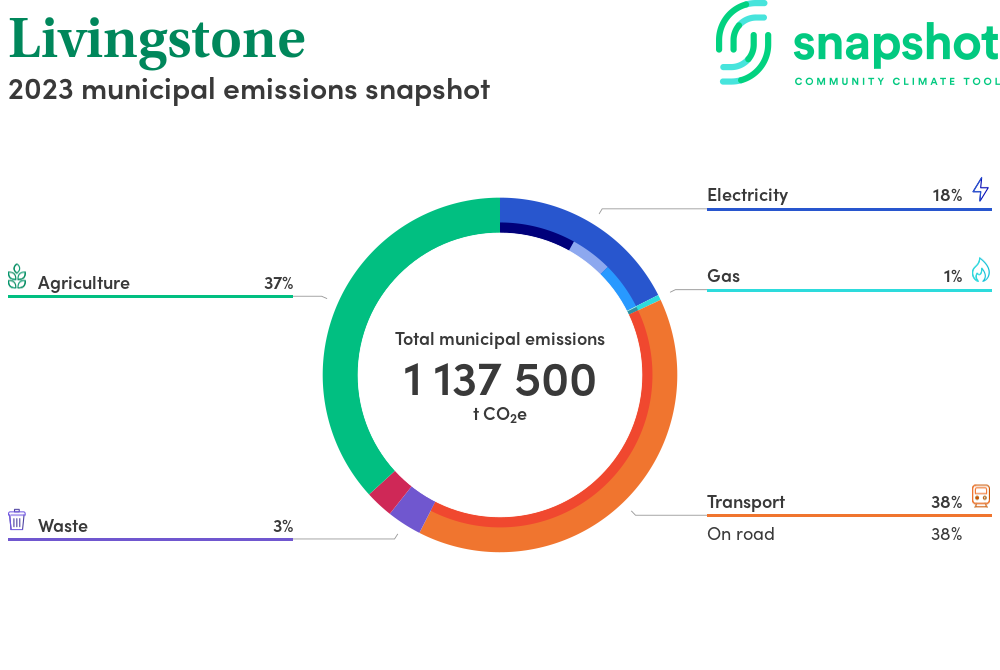 Livingstone is a rural municipality that is large in geographical area relative to the state average and has a moderate urban density. Its major emissions source is agriculture, due to the community’s relatively large amount of agricultural activity and low population. The second largest source of emissions is on road transportation.