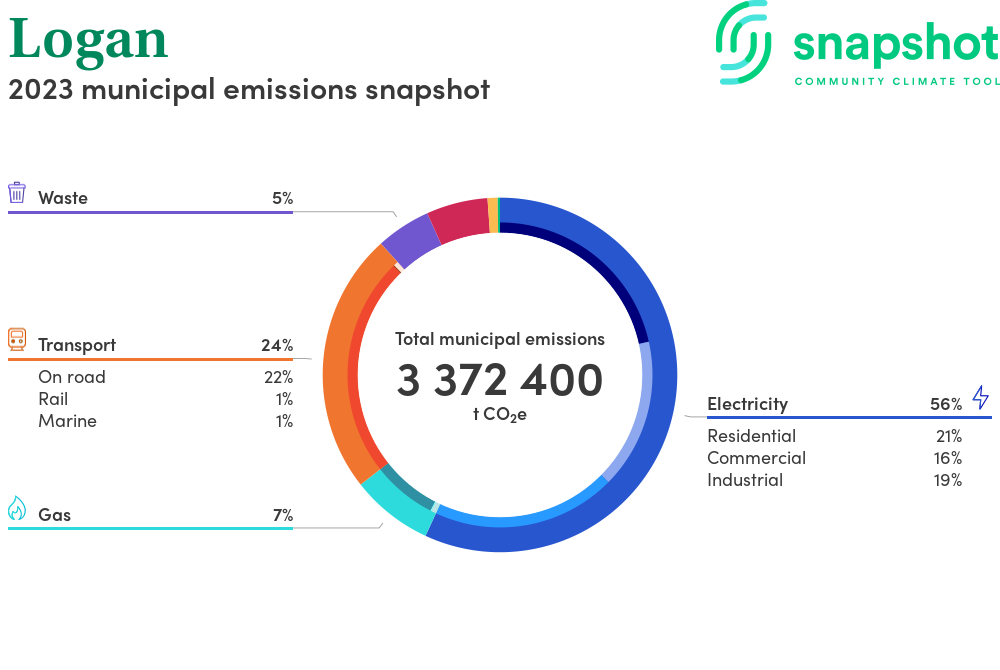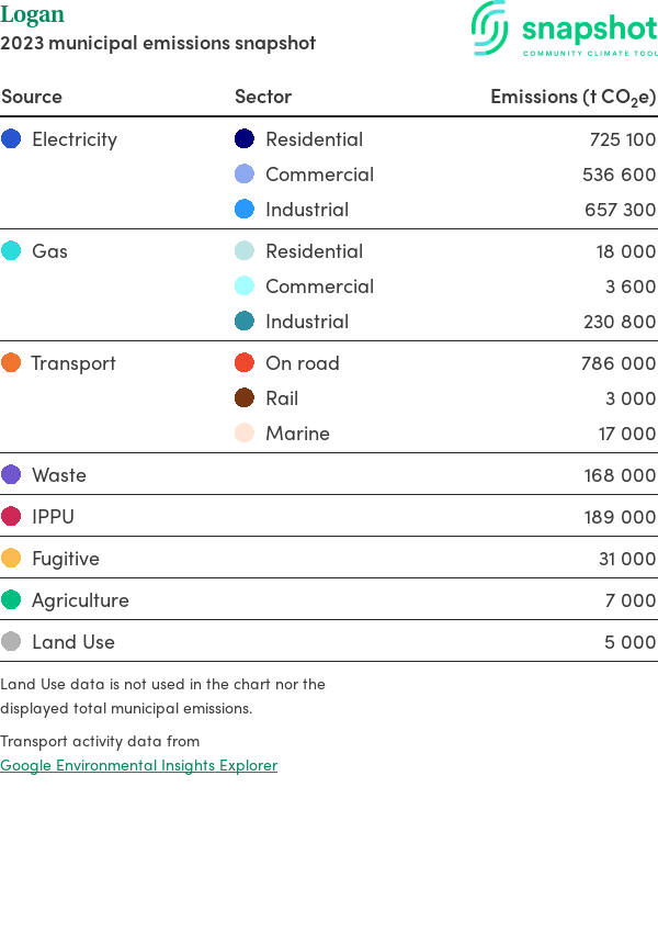 Logan is a city that is geographically small relative to the state average and has a very high urban density. Its major emissions source is electricity consumption with the majority of this coming from residential electricity consumption.
