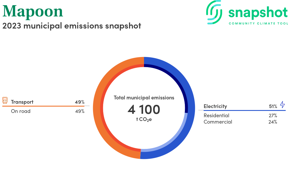 Mapoon is a rural municipality that is geographically small relative to the state average and has a low urban density. Its major emissions source is on road transportation, due to the community’s larger commuting and other travel requirements. The second largest source of emissions is residential electricity consumption.