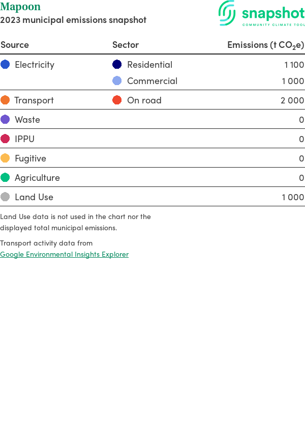 This report outlines the major sources of carbon emissions for the entire region (municipality, electorate, or state). Due to the approximate nature of the profile, the emission values are represented as rounded numbers. This report includes the following sources: