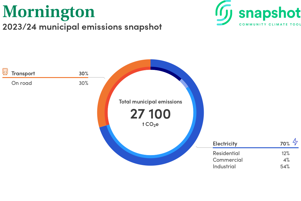 Mornington is a rural municipality that is geographically small relative to the state average and has a low urban density. Its major emissions source is electricity consumption with the majority of this coming from industrial electricity consumption.