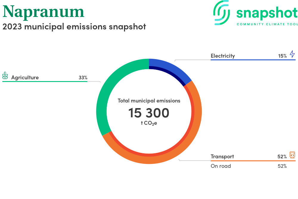 Napranum is a rural municipality that is geographically small relative to the state average and has a low urban density. Its major emissions source is on road transportation, due to the community’s larger commuting and other travel requirements. The second largest source of emissions is agriculture.