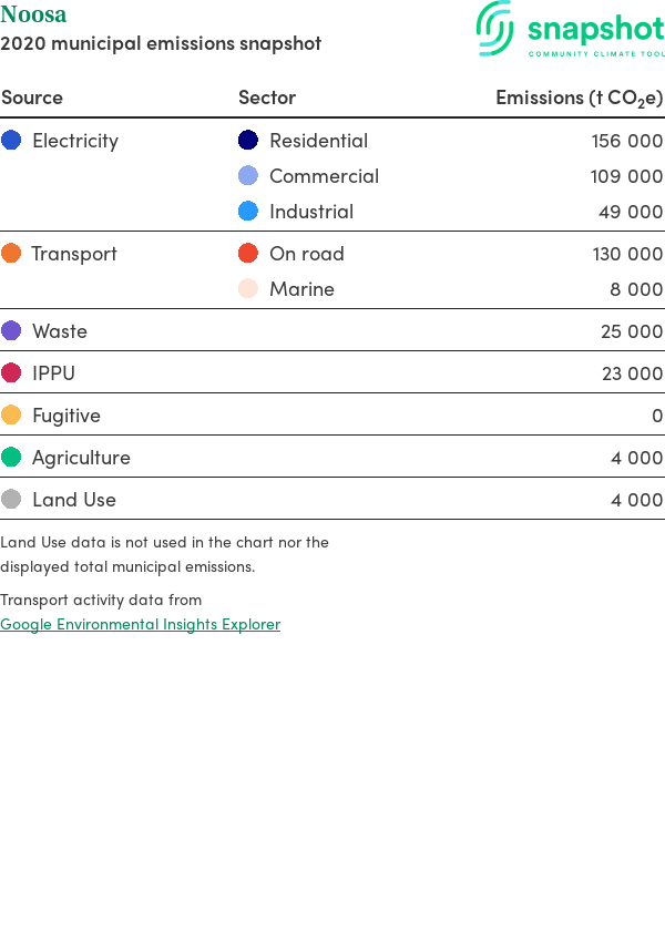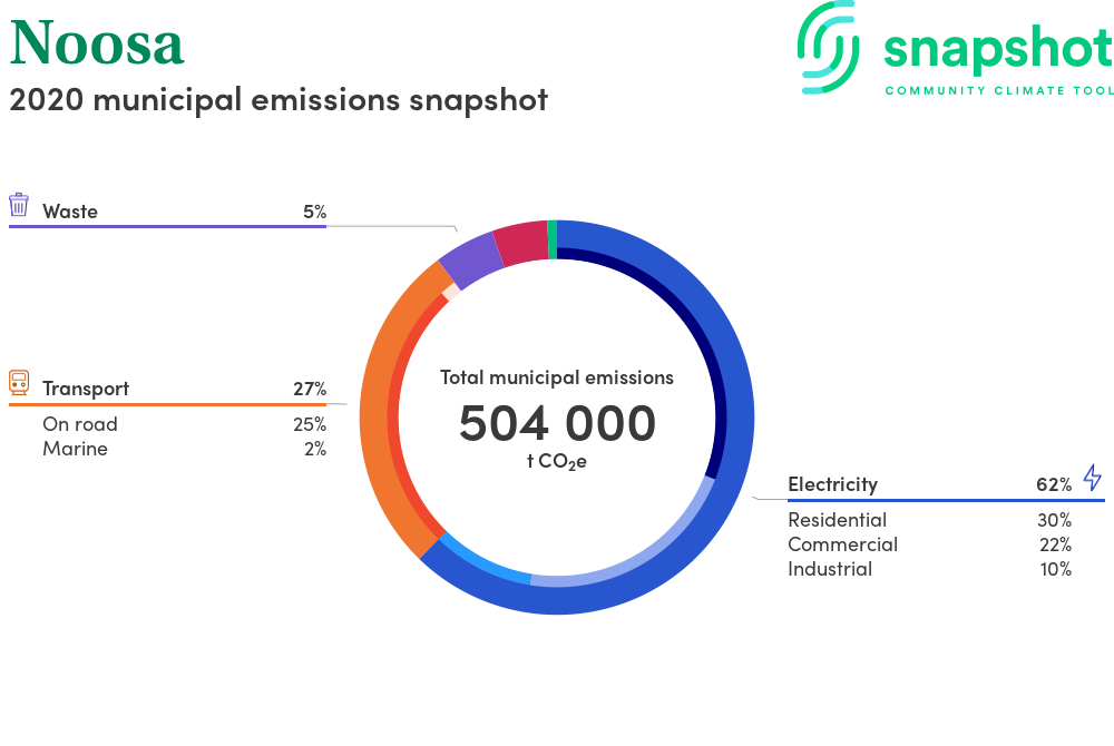 Noosa is a rural municipality that is geographically small relative to the state average and has a high urban density. Its major emissions source is electricity consumption with the majority of this coming from residential electricity consumption.