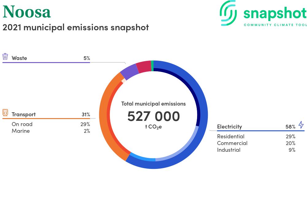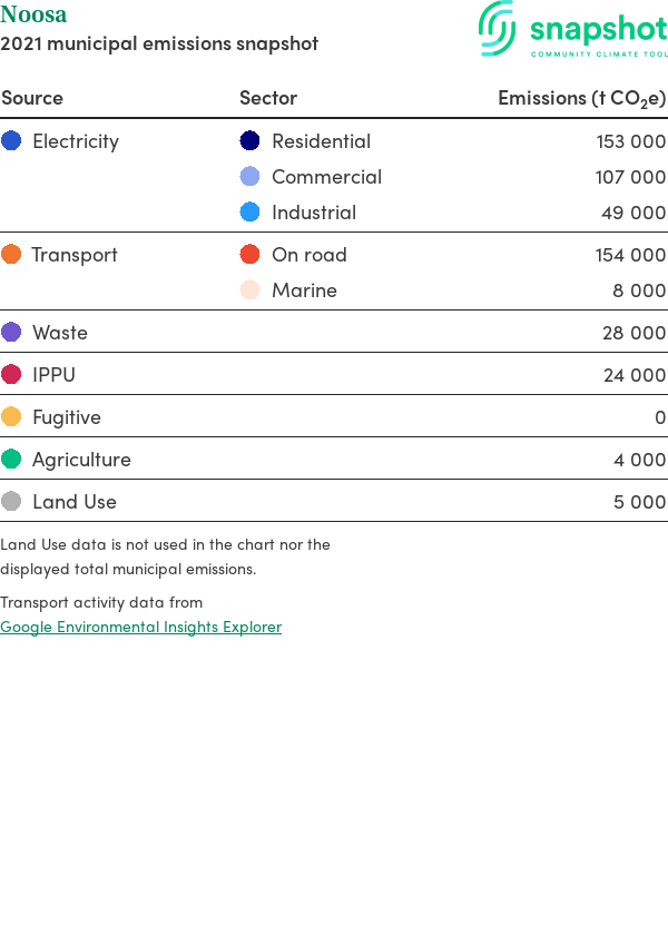 Noosa is a rural municipality that is geographically small relative to the state average and has a high urban density. Its major emissions source is electricity consumption with the majority of this coming from residential electricity consumption.