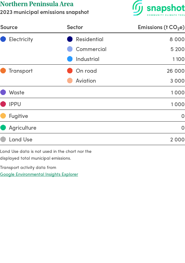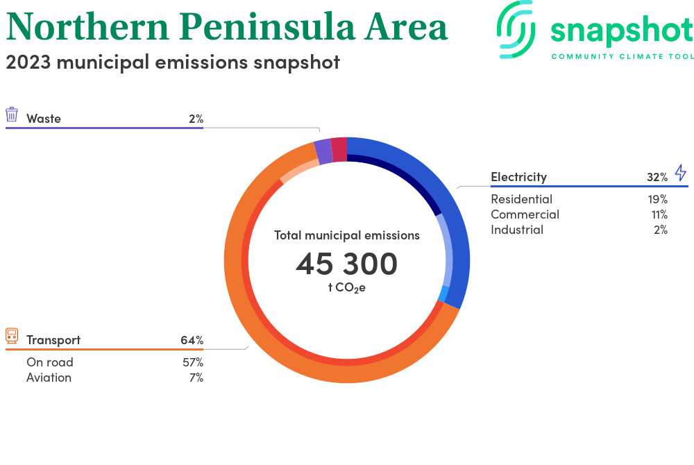 Northern Peninsula Area is a regional area that is geographically small relative to the state average and has a moderate urban density. Its major emissions source is on road transportation, due to the community’s larger commuting and other travel requirements. The second largest source of emissions is electricity consumption.