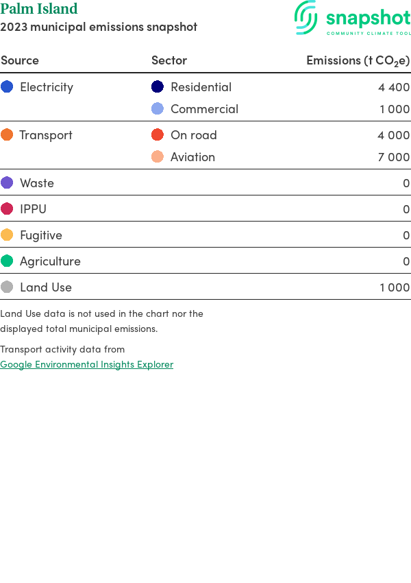Palm Island is a rural municipality that is geographically very small relative to the state average and has a high urban density. Its major emissions source is aviation, due to the community’s presence of an airport. The second largest source of emissions is electricity consumption.