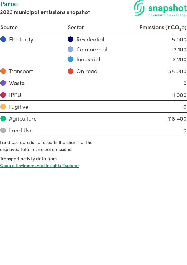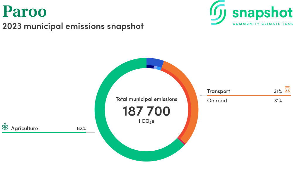 Paroo is a rural municipality that is very large in geographical area relative to the state average and has a low urban density. Its major emissions source is agriculture, due to the community’s relatively large amount of agricultural activity and low population. The second largest source of emissions is on road transportation.