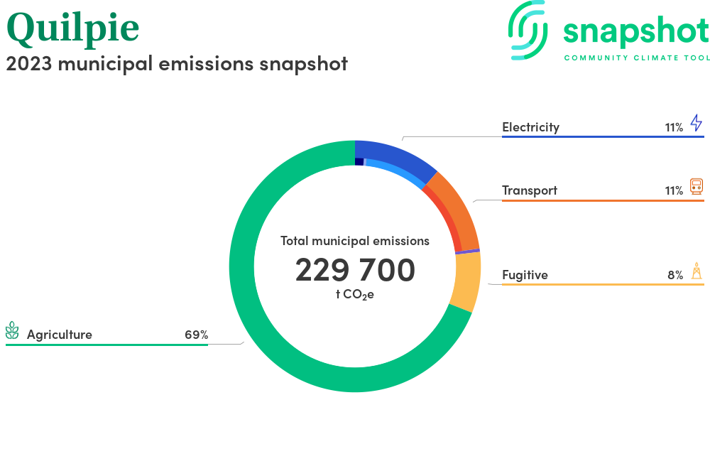 Quilpie is a rural municipality that is very large in geographical area relative to the state average and has a very low urban density. Its major emissions source is agriculture, due to the community’s relatively large amount of agricultural activity and low population. The second largest source of emissions is on road transportation.