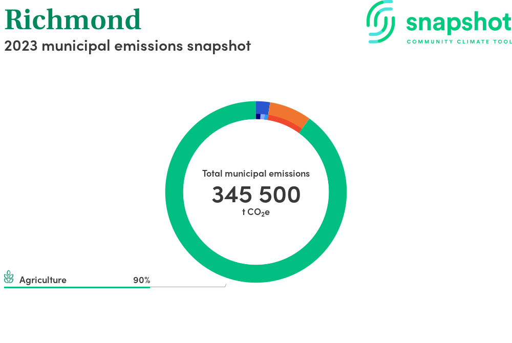 Richmond is a rural municipality that is large in geographical area relative to the state average and has a very low urban density. Its major emissions source is agriculture, due to the community’s relatively large amount of agricultural activity and low population. The second largest source of emissions is on road transportation.