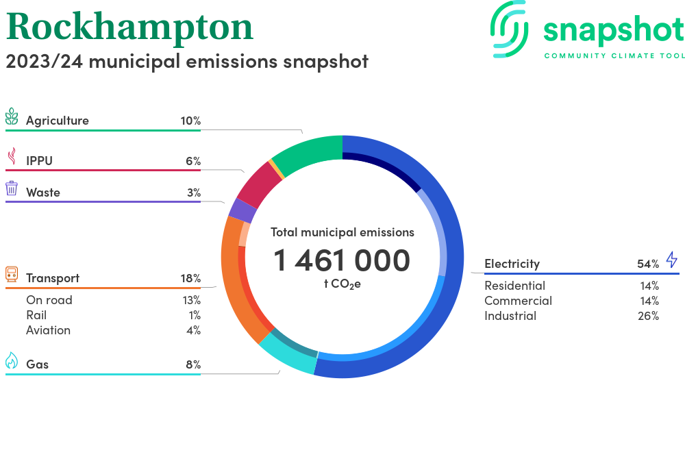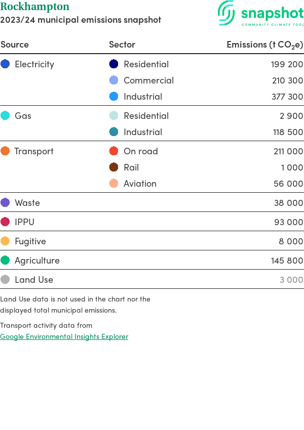 Rockhampton is a regional area that is moderate in size relative to the state average and has a moderate urban density. Its major emissions source is electricity consumption with the majority of this coming from industrial electricity consumption.
