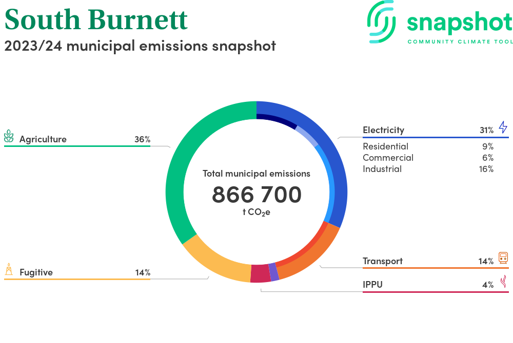 South Burnett is a regional area that is large in geographical area relative to the state average and has a moderate urban density. Its major emissions source is agriculture, due to the community’s relatively large amount of agricultural activity and low population. The second largest source of emissions is electricity consumption.